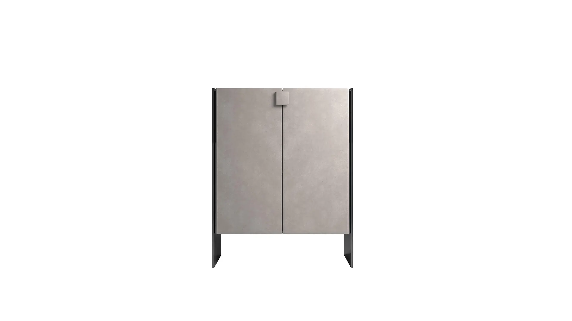 Next Level bar cabinet with black chrome sides, cedar wood structure, wood or leather doors, lacquered and leather-lined interior, and metal handle with leather insert.