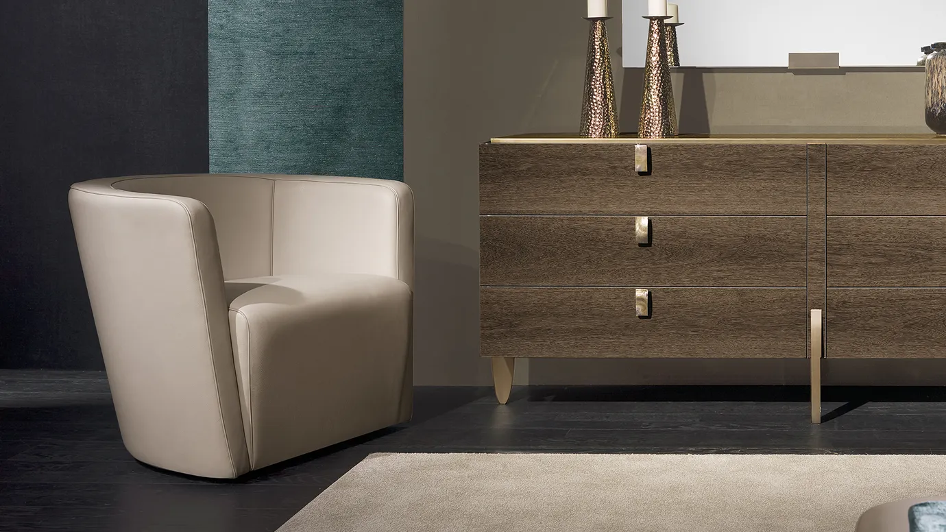La poltrona è caratterizzata da una forma avvolgente, di forma circolare, ed è completamente imbottita e rivestita in pelle o tessuto.